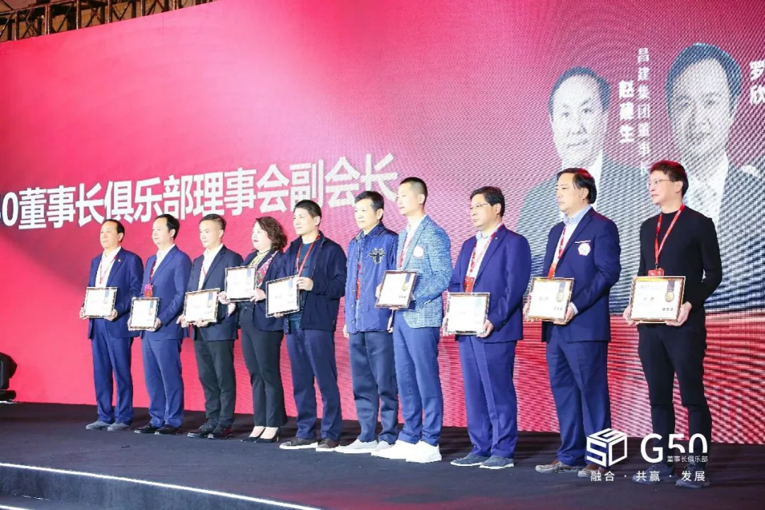 在諸位專家和企業家的精彩分享之后,迎來了本次活動的重要時刻,第二屆G50董事長俱樂部副會長授牌儀式。家樂園集團董事長廖禮基、昌建控股董事長趙建生、興進集團董事長羅欣、東投集團董事長陳東旭、房源集團董事長劉永國,三巽集團董事長錢堃、新華控股集團董事長吳成柱、萬星房地產集團董事長董大賡、貝蒙置地董事長蘇醒當選為第二屆G50董事長俱樂部副會長。