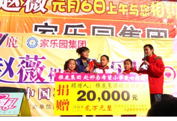 07年元月6日,在河北省邢臺市家樂園購物廣場,影視巨星趙薇應邀參加了“雅鹿 趙薇相約家樂園”大型見面會活動,與牛城“小燕子”迷“零距離”接觸,并和雅鹿集團聯合向家樂園希望小學捐贈價值2萬元的羽絨服,為貧困孩子獻上一份愛心。