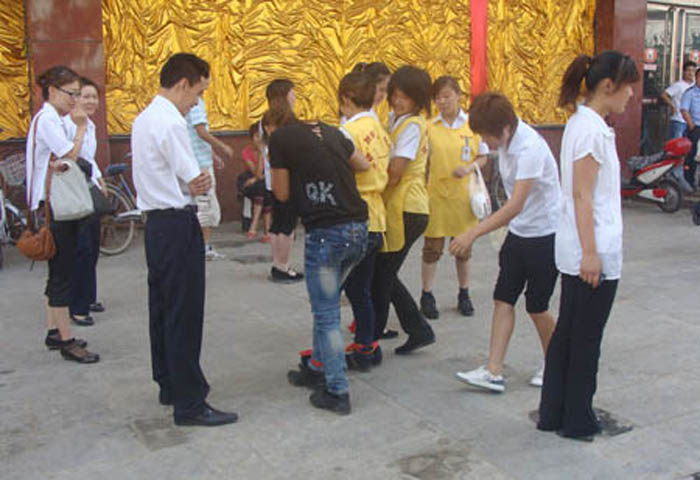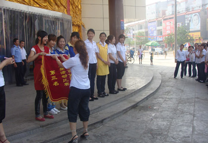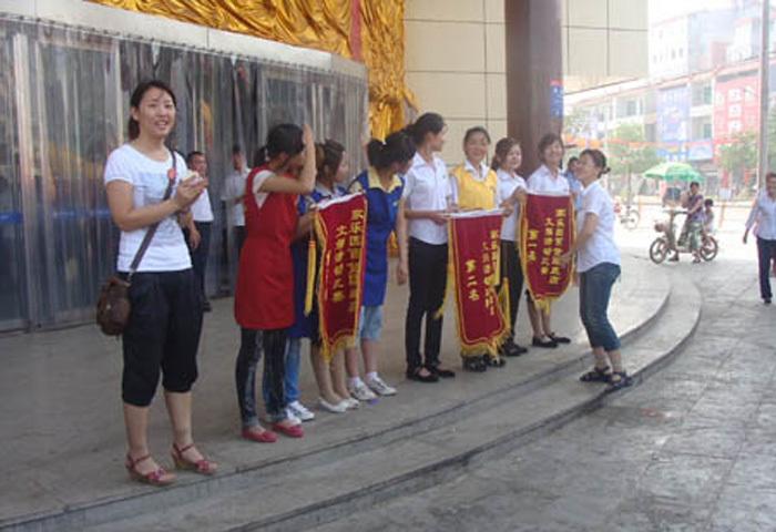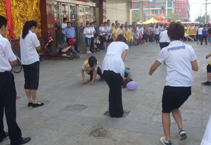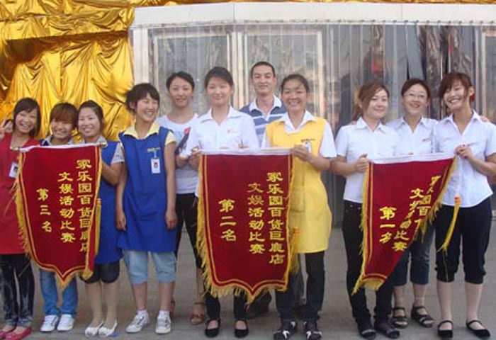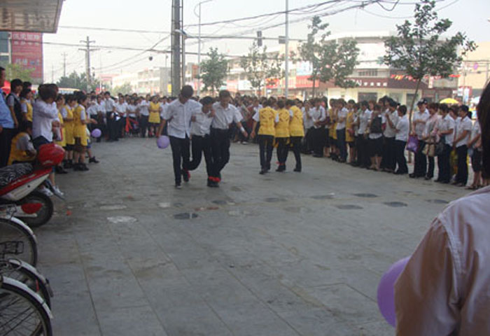 為豐富員工文娛生活, 2010年6月21日早8:00家樂園百貨巨鹿店在商場外廣場組織進行了“大家齊步走”活動?;顒右圆块T為單位,以三人為一小隊“大家齊步走”(將相鄰兩人的腿捆綁在一起)。在行走過程中,需位于中間的隊員手拿氣球,氣球不得掉落。按規則用時最短者為獲勝隊?;顒舆^程中,由于步幅大小不一,有員工不慎摔倒,但在部門員工的幫助下,迅速地站起來,喊著口號,互相協作,大步向前。此次活動在輕松愉悅的氛圍中增強了員工的集體榮譽感及團隊凝聚力,從而使員工以更加飽滿的熱情投入到工作及服務中去。