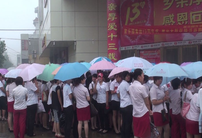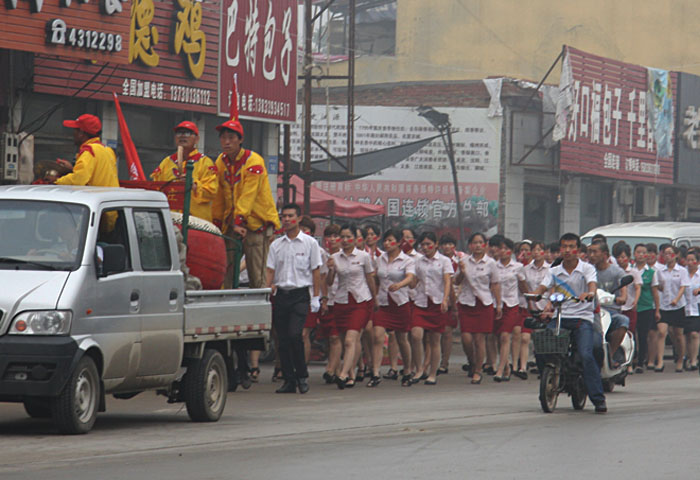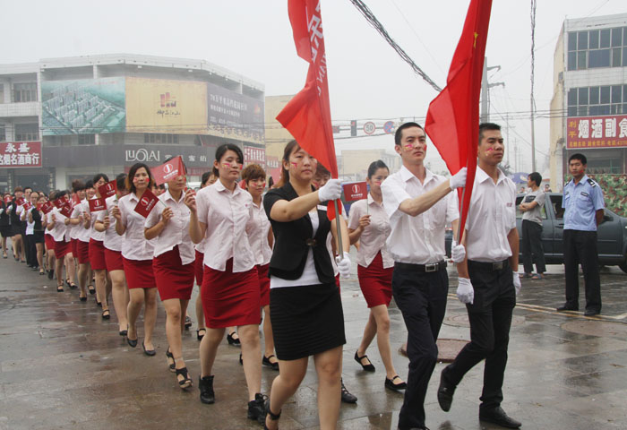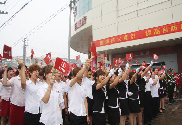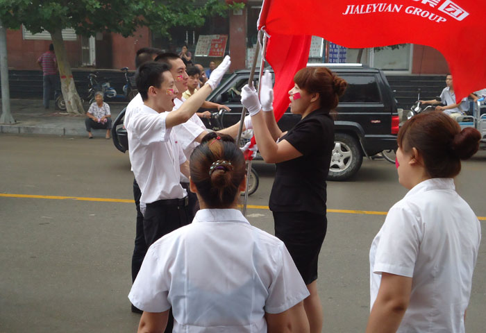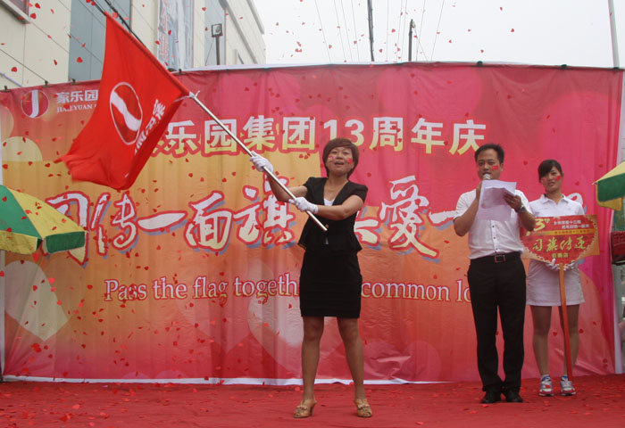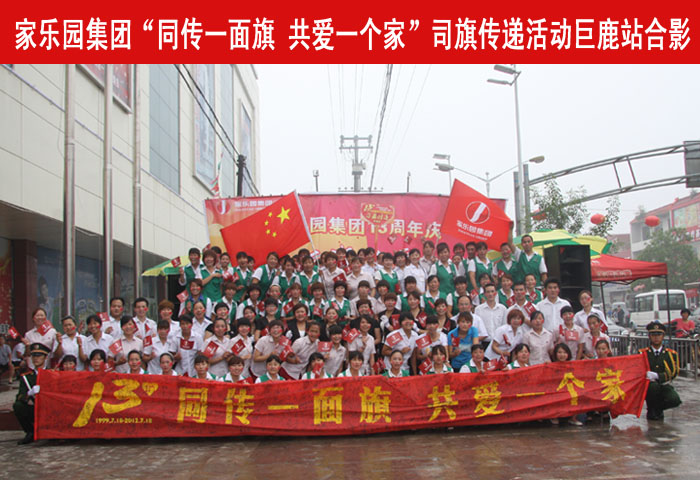 鑼鼓喧天,彩旗飄揚,7月8日早8:30,經過連日的傳遞,司旗抵達巨鹿店,通過巨鹿縣主干道,分10個站點抵達主會場——家樂園百貨巨鹿店。廣場上員工們嘹亮的《家樂園之歌》響徹云霄,大家振臂高呼 “快樂家園,百年基業,家樂園,加油、加油、加油!”的口號震撼著每一個人的心靈。迎接司旗傳遞的活動現場熱烈隆重,承載著家樂園員工所有愿景的司旗在巨鹿店內外傳遞。