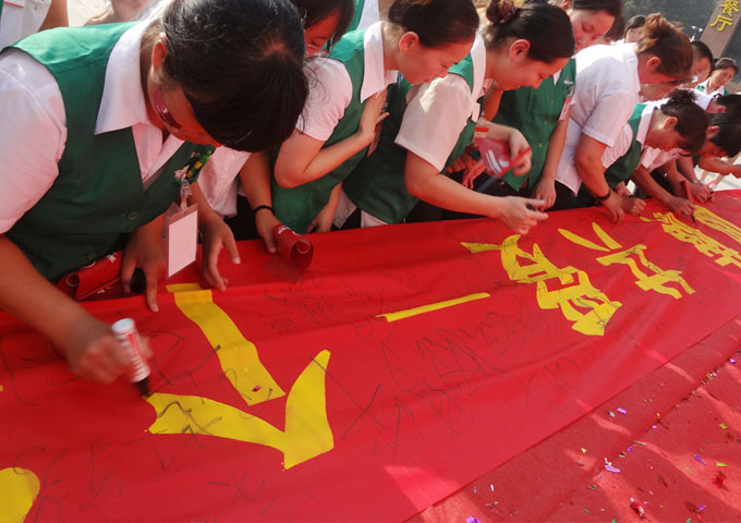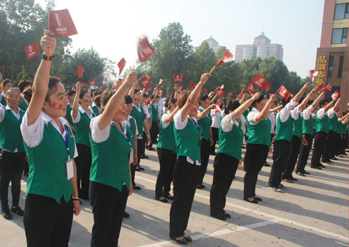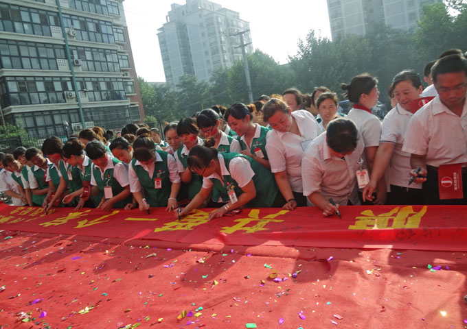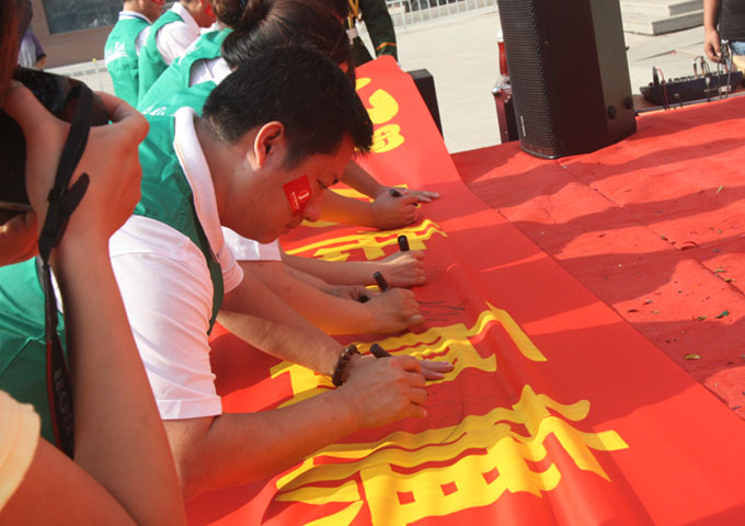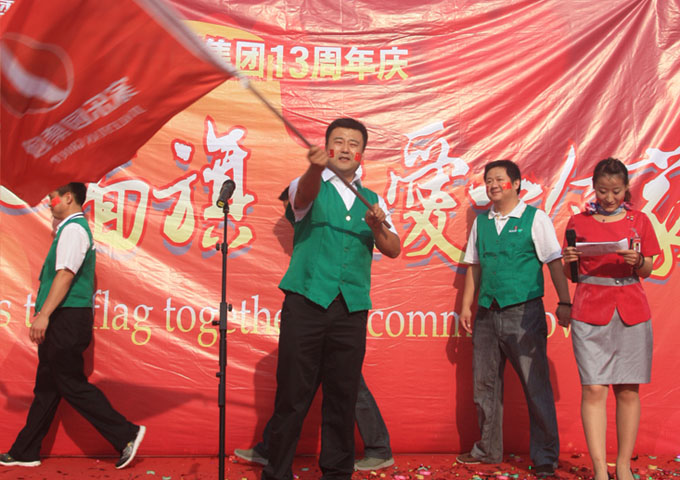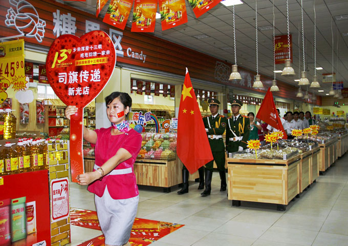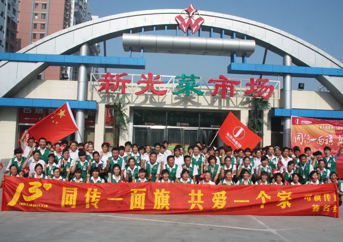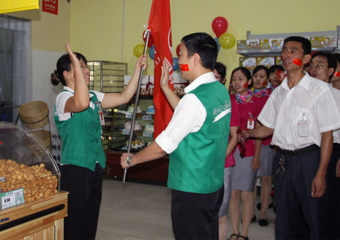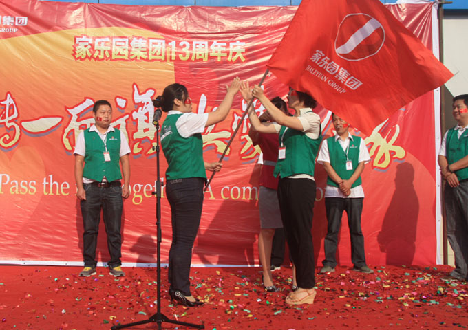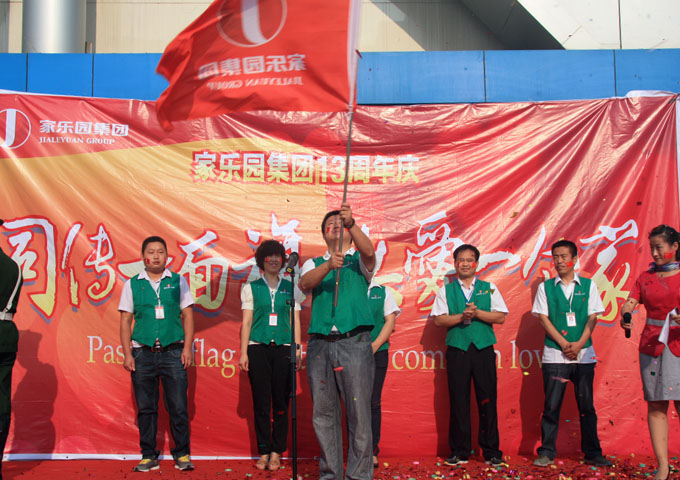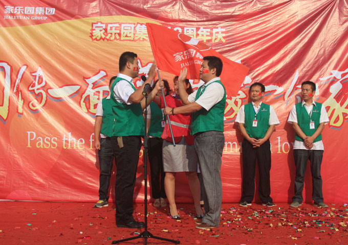 7月12日早上7點(diǎn)整,新光店店長(zhǎng)李志強(qiáng)帶領(lǐng)全體員工整齊列隊(duì)在舞臺(tái)前,個(gè)個(gè)臉貼國(guó)旗,手握司旗精神飽滿等待護(hù)旗隊(duì)伍的到來(lái)。7:50事業(yè)部的各位代表走上舞臺(tái),事業(yè)部副總經(jīng)理吳杰宣布家樂(lè)園“同傳一面旗,共愛一個(gè)家”第13站新光店司旗傳遞活動(dòng)正式開始……