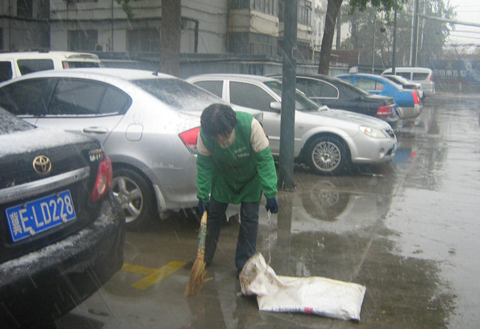 2013年4月19日,本就是一個陰雨天,下午時分,天空突降大雪,鵝毛般的大雪紛飛,路上的行人紛紛怨聲載道,埋怨著這“春如四季”的惡劣天氣。可是此時,我們似乎忽略掉了什么:廣場上來往的車輛,是誰在指揮?送貨車已經到達,是誰在卸貨、搬貨?門店前已經有了部分積雪,是誰在風雨中拿起笤帚,默默地清理著?是他們,是你們,是我們身邊的家樂園人!